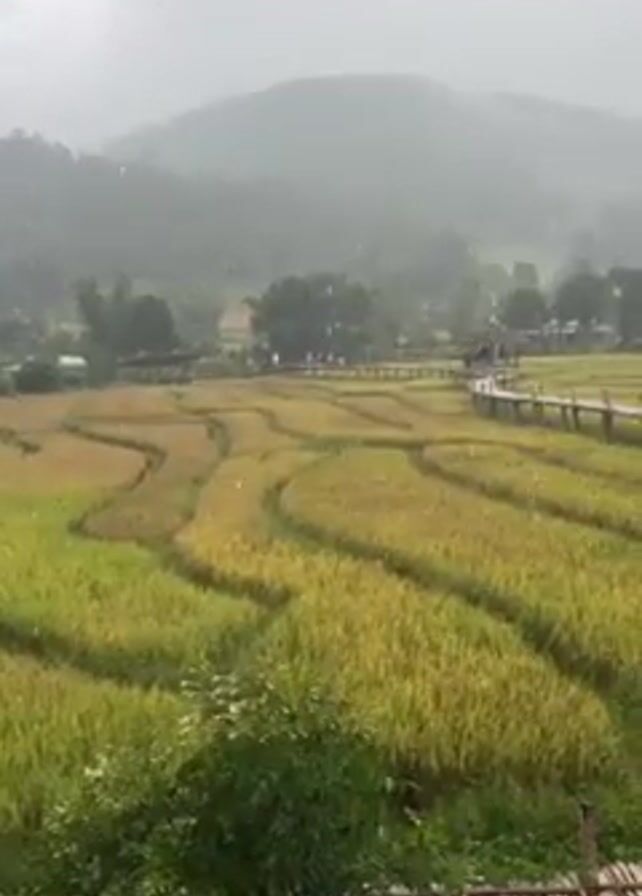 landscape of a rice field during a light rain. The rice paddy is terraced, with a wooden walkway running across it. In the background are green, misty hills and scattered buildings. The rice is predominantly yellow, suggesting it's nearing harvest. The sky is overcast, contributing to the misty atmosphere. No distinct human actions are visible.