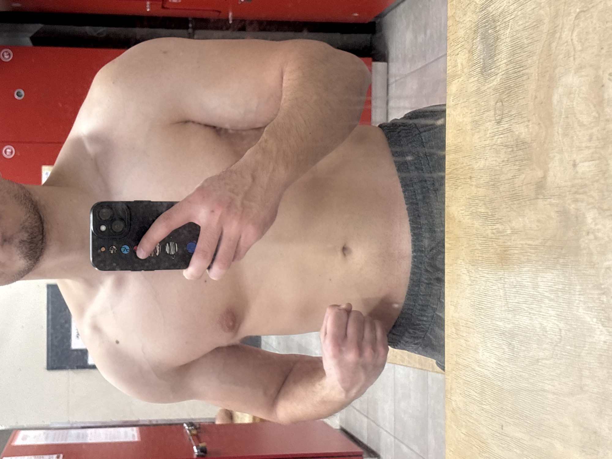 A shirtless male subject is taking a selfie with a smartphone in a locker room