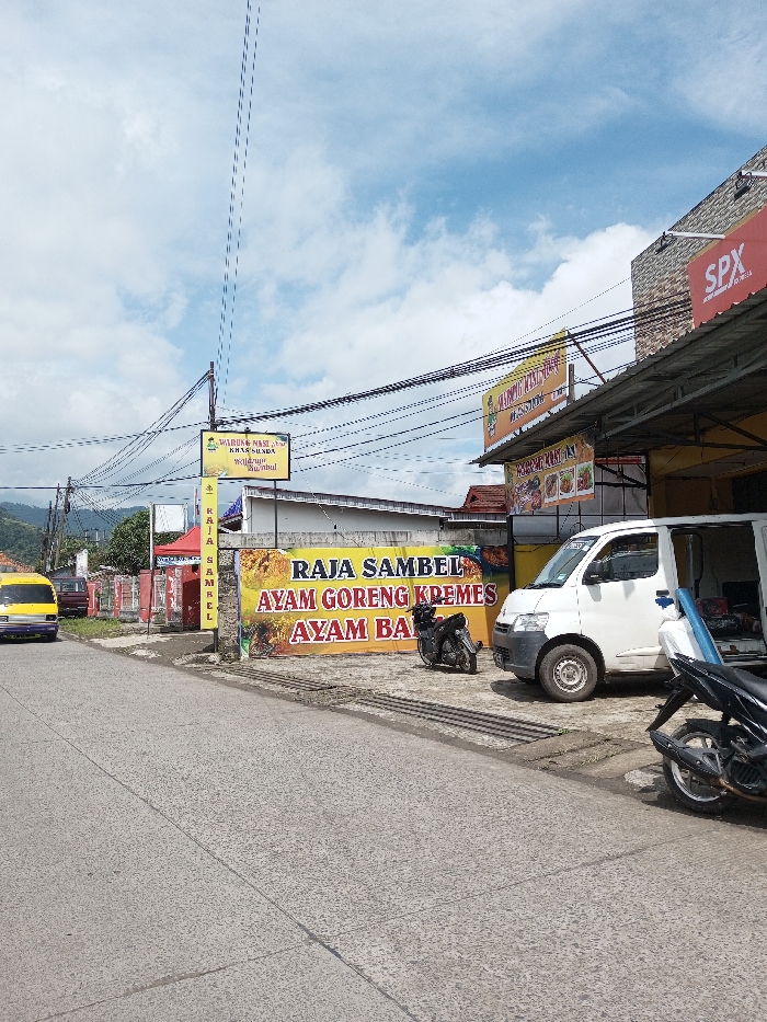 This image depicts a daytime street scene in Ariyalai, Sri Lanka. The foreground shows a concrete road with a curb and drainage grate. On the right side, a white cargo van, possibly a Daihatsu Gran Max, is parked on a paved area adjacent to a commercial building; its sliding side door is open, revealing items inside. Two motorcycles are parked near the van: a black motorcycle closer to the building and a black and grey scooter partially visible to the right. A large yellow banner, affixed to the building, displays the text "RAJA SAMBEL AYAM GORENG KREMES AYAM BA". Above it, a smaller yellow sign reads "WARUNG NASI KHAS SUNDA WAK RUMAN SAMBAL", and a tall, slender yellow sign post vertically states "RAJA SAMBEL". The upper portion of the building on the right features a prominent red "SPX" sign. On the left side of the road, a yellow and blue minibus is parked. Behind the minibus, a red-fenced area contains a red tent structure. The background reveals green, tree-covered hills under a partly cloudy sky. Numerous overhead power lines and utility cables crisscross the upper portion of the frame.
