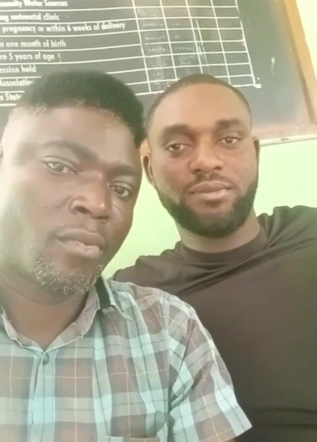 Two men pose for a selfie indoors. The man on the left wears a light blue and green plaid shirt, while the man on the right wears a black t-shirt. Both men have dark skin and facial hair. They stand close together. Behind them, a green and white chart is visible, containing information organized in rows and columns.