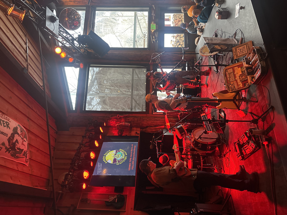 A live band performs on stage in a rustic venue with wood paneling. They are illuminated by red stage lights. A disco ball hangs overhead, and large windows reveal an outdoor scene. A screen displays the band's name, "Aaron Davis & The Mystery Machine," along with their Venmo tip information and social media handle. A poster hangs on the wall nearby. Patrons are seated at a bar in the background.