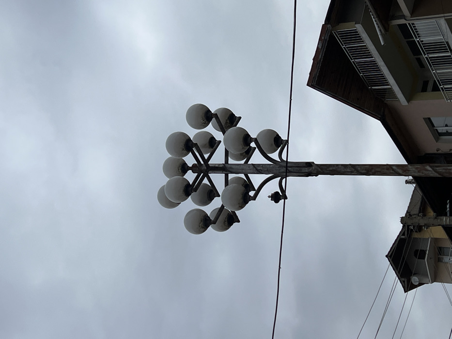 The image depicts an urban street scene in Nedelino, Bulgaria, under an overcast sky. A tall, dark, weathered metal street lamp post with a decorative spiral-fluted shaft dominates the upper center. This pole supports 15 white, spherical luminaires arranged in a multi-tiered, candelabra-like structure via curved metal arms; some globes display visible grime. A thick, dark horizontal electrical wire stretches across the mid-ground, passing in front of the lamp pole, where a dark cylindrical insulator is attached. Additional thinner, dark electrical wires are visible in the lower-left. To the right, the upper portion of a building with a light-colored facade, a prominent dark brown sloped roof, and wooden eaves is present. An upper-floor balcony with a silver-colored metal railing is visible on this structure. Partially visible behind the lamp pole on the left is another building with a lighter facade, featuring a distinctive rounded architectural element on an upper level and a small satellite dish. No individuals or discernible activities are depicted.