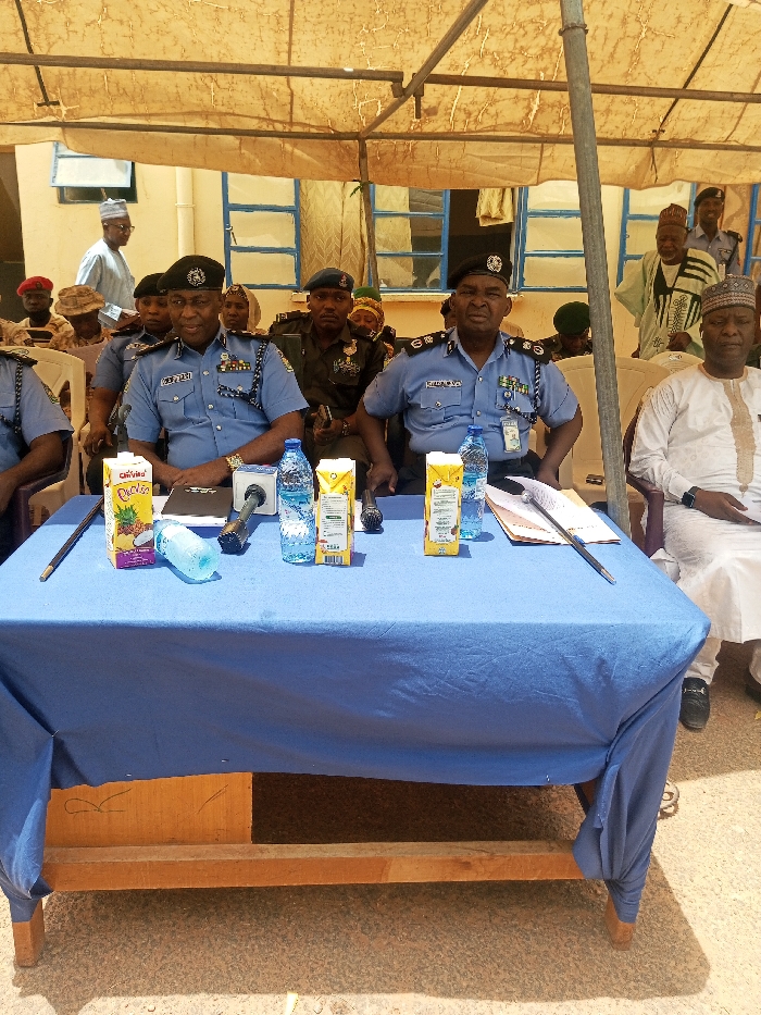 group of men sitting at a table covered in a blue tablecloth. Four men in blue uniforms are seated in the front row, with the three on the left wearing what appears to be police uniforms. Two of the men in uniforms have their hands clasped in front of them, while the man at the far left is holding a microphone. The man in the middle has a microphone in front of him. The man in the far right is wearing a white traditional robe and has one hand on a chair, while the other rests on the table. The man on the right is sitting upright, looking directly at the camera. There are also four bottles of water on the table in front of them, along with a box of pineapple juice. Three microphones are placed in front of the table. A man in blue uniform is seated behind the man wearing a white robe. There is a second row of men seated behind the front row, and a third row of men standing behind the second row. Some of the men in the background are wearing white traditional robes, while others are wearing civilian clothing. The scene takes place in a partially enclosed area with white fabric covering the top. The environment outside of the enclosed area appears to be outdoors, and the ground is a dry, sandy color. The image was taken at the latitude of 12.466 and the longitude of 4.252, which corresponds to a location in the city of Gwadan Gaji, Nigeria.