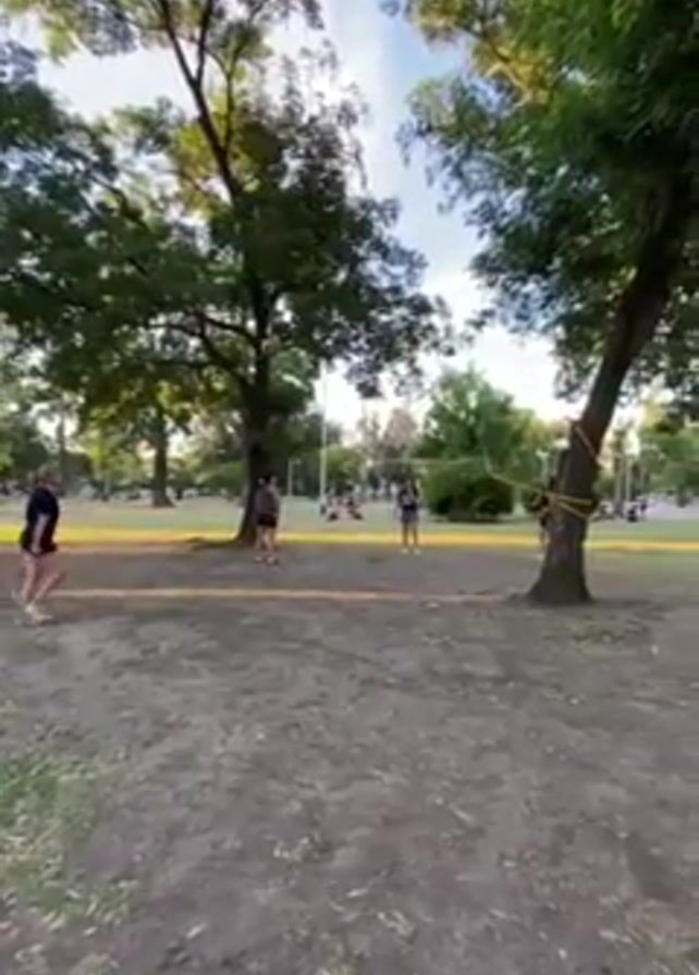 Three people are playing volleyball in a park. A yellow net is strung between two trees. One person on the left is wearing a black t-shirt and black shorts, and serves the volleyball. One person in the center wears a black tank top and black shorts, and a person on the right wears a black t-shirt and grey shorts. Other people are sitting in the grass in the background. There are many trees and a blue sky. The ground is dirt.