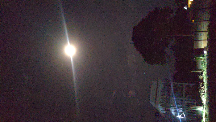 Night scene featuring a bright moon illuminating the dark sky. To the right, a tree and the faint outline of a building structure are visible. The building includes a wall with visible steps or levels, each containing greenery. Below the tree is what seems to be a small yard or garden area, possibly lit by artificial lights. The overall image is grainy due to the low-light conditions.