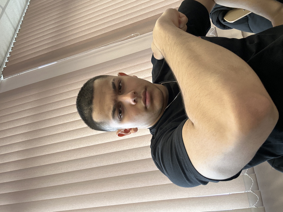 A close-up, chest-up portrait depicts a young adult male in an indoor setting within Svilengrad, Bulgaria. The subject has short, dark hair, dark eyes, and a medium skin tone, with a visible scar or shaved line on the outer portion of his left eyebrow. He wears a plain black short-sleeved t-shirt and a thin silver-colored chain necklace. He is positioned with his right arm bent at the elbow, prominently displaying the flexed bicep and forearm, while his left arm is partially visible behind it in a similar bent position. The background consists of light beige or pale brown vertical blinds, with the top rail and a control chain visible in the upper right quadrant of the image. A dark garment and a light-colored, possibly wooden or plastic, object are partially visible in the lower right, behind the subject's left arm. The subject maintains direct eye contact with the camera.