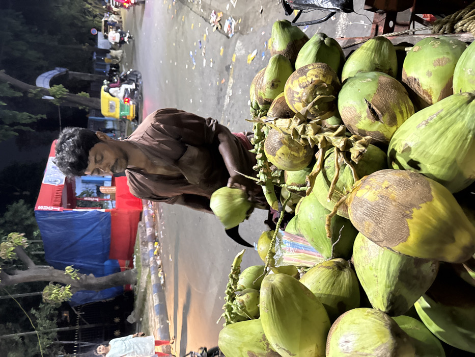 A night scene in Bidhannagar, India, features a male street vendor preparing a green coconut