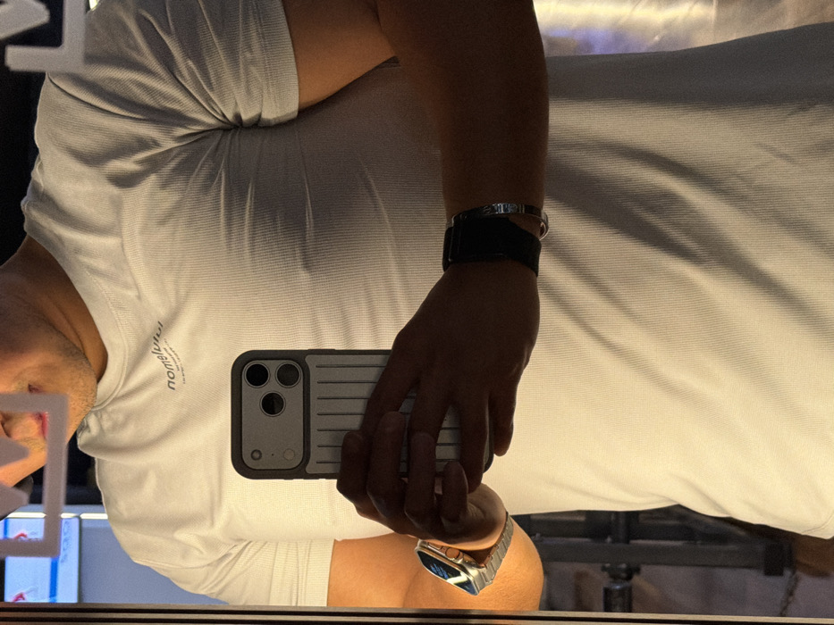 A reflection in a mirror shows a person holding a cell phone. The phone has a grey case and three camera lenses. The person is wearing a white short-sleeved shirt with lettering on the front. On their wrist, they have a watch with a metal band and a black fitness tracker. A metal bracelet is also visible on the same arm. The mirror's surface creates a mirrored effect of the clothing and accessories.