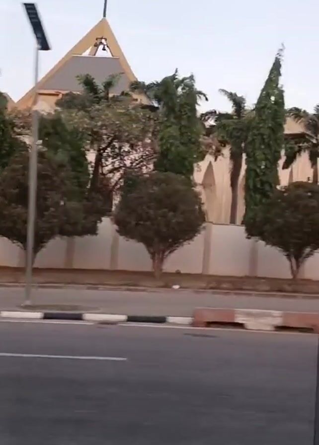 From inside a moving vehicle, the camera records a view of a church with a cross at its peak
