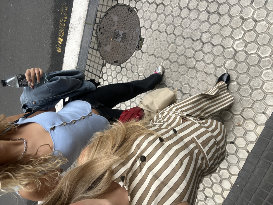A forensic image depicts two individuals standing on a light grey hexagonal concrete paver sidewalk in San Sebastián, Spain. The city is identified by a round, textured metal manhole cover visible on the sidewalk, featuring the text "AGUAS DEL AÑARBE URKIDETZA / UR ZINAK / DONOSTIA - SAN SEBASTIÁN" and a city coat of arms emblem. The individual in the foreground, partially visible from the chest down, has long blonde hair and wears a brown and white vertically striped sleeveless top with dark buttons and matching wide-leg trousers, paired with black pointed-toe flat shoes. A red handbag and a light brown paper bag rest near their feet. The second individual, partially visible from the chest down, has curly blonde hair and wears a light blue ribbed sleeveless top with gold-colored buttons down the front and dark trousers. They hold a clear plastic water bottle in their right hand, with a blue denim jacket draped over their left arm. Their visible footwear is a multi-colored sneaker with white, pink, and grey/silver sections. The sidewalk borders an asphalt street with a painted white line and a faded yellow line. Both individuals appear to be standing stationary.