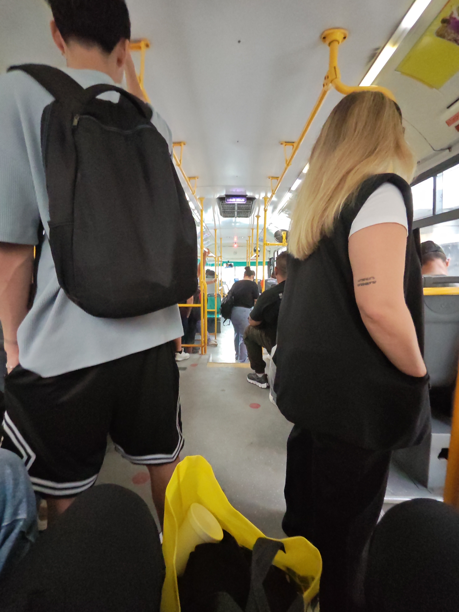 The image depicts the interior of a public bus, likely within the city of Buenos Aires, Argentina, based on the “CUIDADOS” signage above the seats, a common feature in Buenos Aires public transport. A man with a black backpack stands in the foreground, facing away from the camera. Beside him, a woman with blonde hair, wearing a black vest over a white t-shirt, stands with her hands in her pockets. In the background, several other passengers are visible, some seated and some standing, indicating a moderately crowded bus. Yellow handrails run along the ceiling for passengers to hold onto. Near the camera, a yellow shopping bag is also visible. The environment suggests a typical urban commuting scene.