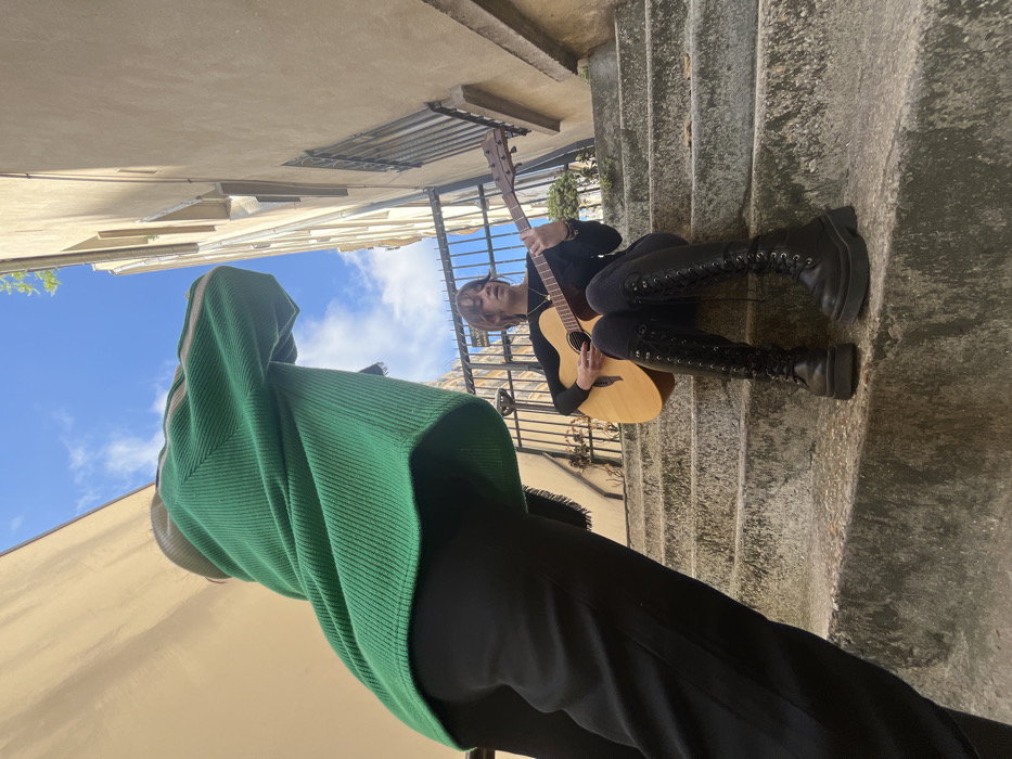 The image depicts a low-angle view of two individuals in an outdoor stairwell or narrow passage, typical of historic Parisian architecture. In the foreground, partially obscuring the scene, is a person standing with their back mostly to the camera, wearing a ribbed emerald green long-sleeved sweater with two beige stripes on the upper arm and black trousers; only their torso and left leg are visible. Up a set of weathered stone steps, a young female is seated, actively playing an acoustic guitar. She wears a black long-sleeved top, black skinny pants, and knee-high black platform combat boots with extensive lacing. Her dark hair has bangs, and she wears a necklace; her mouth is slightly open. Behind the seated individual, a dark wrought-iron gate is visible, bearing a partial sign displaying "DANG". The passage is enclosed by tall, aged, light-colored buildings, one of which on the right features a window with horizontal security bars. The sky above is clear blue with scattered white clouds, indicating daylight, and a small amount of green foliage is visible at the top edge of the buildings.