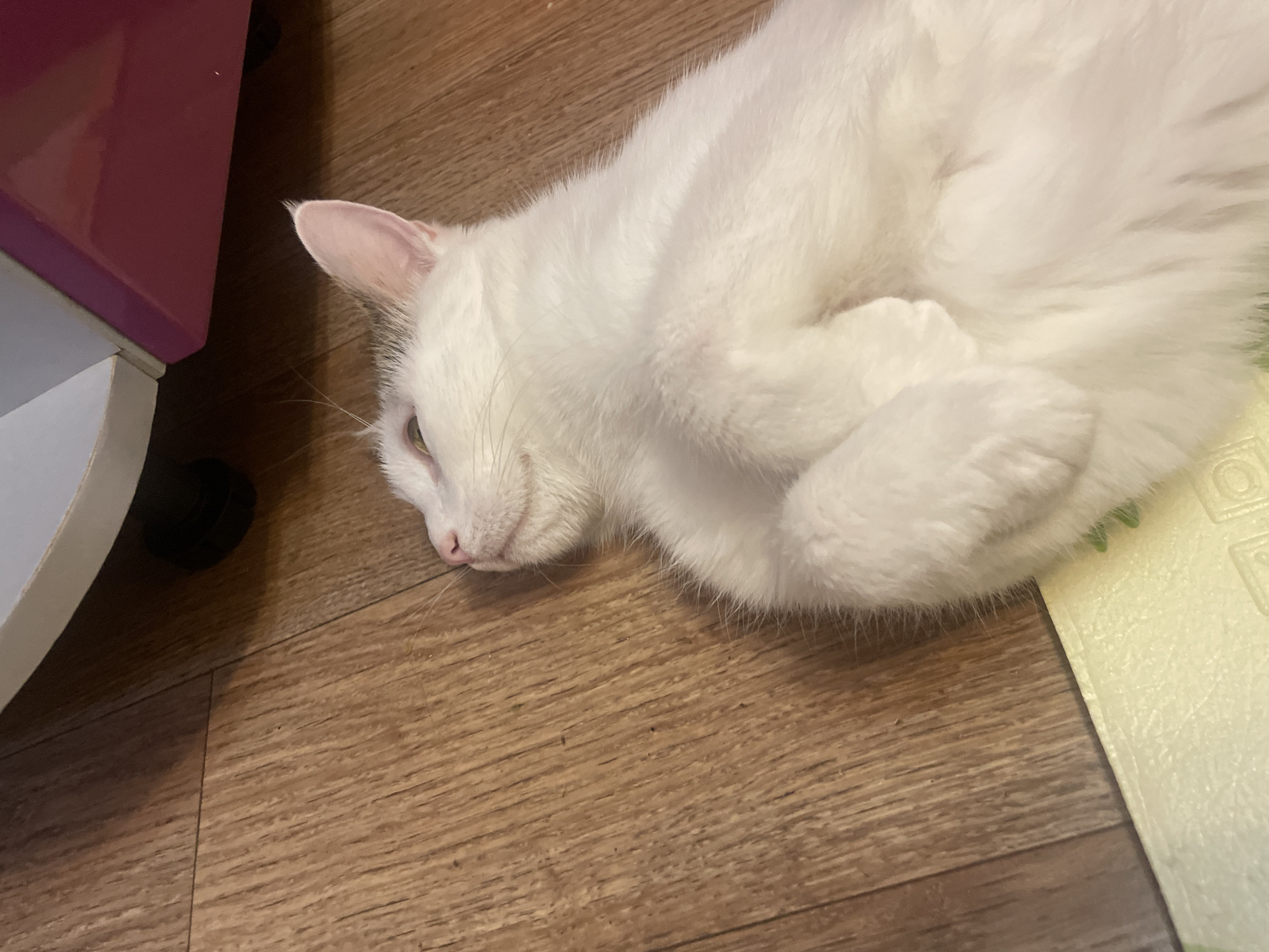 - "A white cat is lying on a wooden floor" by FM-6N9303, licensed under CC BY 4.0