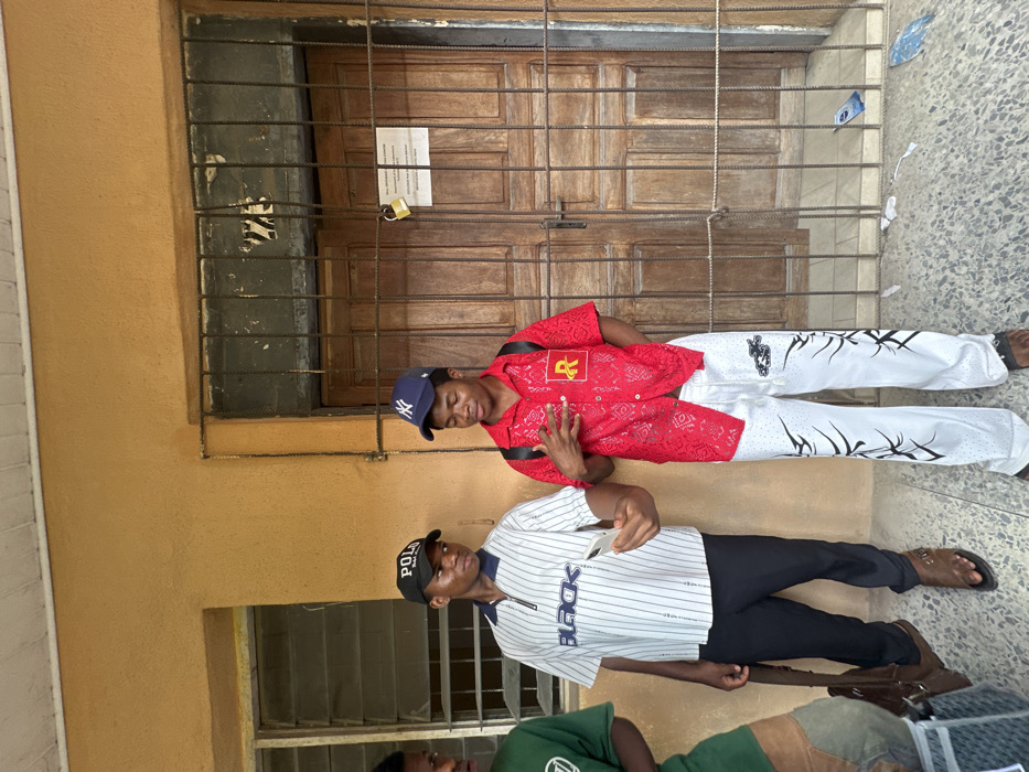 Three young males stand outside a building with an ochre-colored textured exterior wall in Ihiagwa, Nigeria. The building features two windows with horizontal louvered slats on the left and a double wooden door on the right, secured by a dark, possibly rusted, metal gate. A golden padlock secures the gate, and a white paper notice is affixed to the right door panel behind the bars. The ground is a light gray paved surface with scattered litter, including a blue wrapper and white scraps. From left to right: 1. A male in a green t-shirt is partially visible on the far left. 2. A male in the center wears a black baseball cap with "POLO" text, a white and blue pinstripe polo shirt with "BLACK" on the chest, black pants, and brown sandals. He holds a white smartphone in his right hand, angled as if capturing an image or video, and looks towards the right. A brown messenger bag is slung over his left shoulder. 3. A male on the right wears a navy blue New York Yankees baseball cap, a red short-sleeved button-up shirt with a bandana-like pattern and a yellow/gold "R" patch on the left chest pocket, and white pants with black tribal/flame-like designs. He wears dark sandals and a black backpack. His left hand is raised, performing a specific hand gesture, and he looks downwards and to his left.