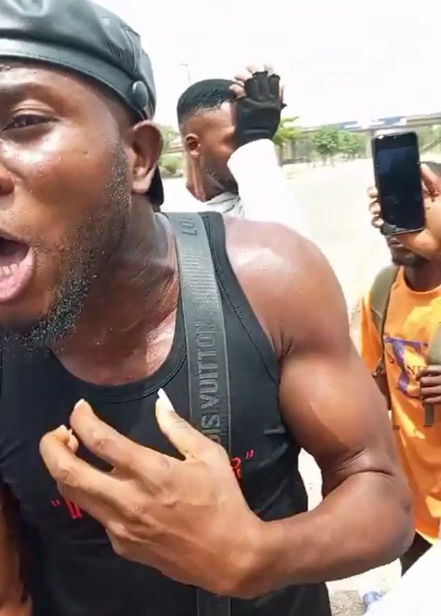 Here is a detailed description of the video: The video features a man in a black tank top with the word “INFLUENCER” on the front, wearing a black hat and Louis Vuitton strap across his shoulder. He is surrounded by several people, some of whom are holding phones and filming him. A microphone is also visible. The man appears to be agitated and is shouting something. His skin is shiny with perspiration. The background includes a road and some greenery. The scene appears to be outdoors during the day.