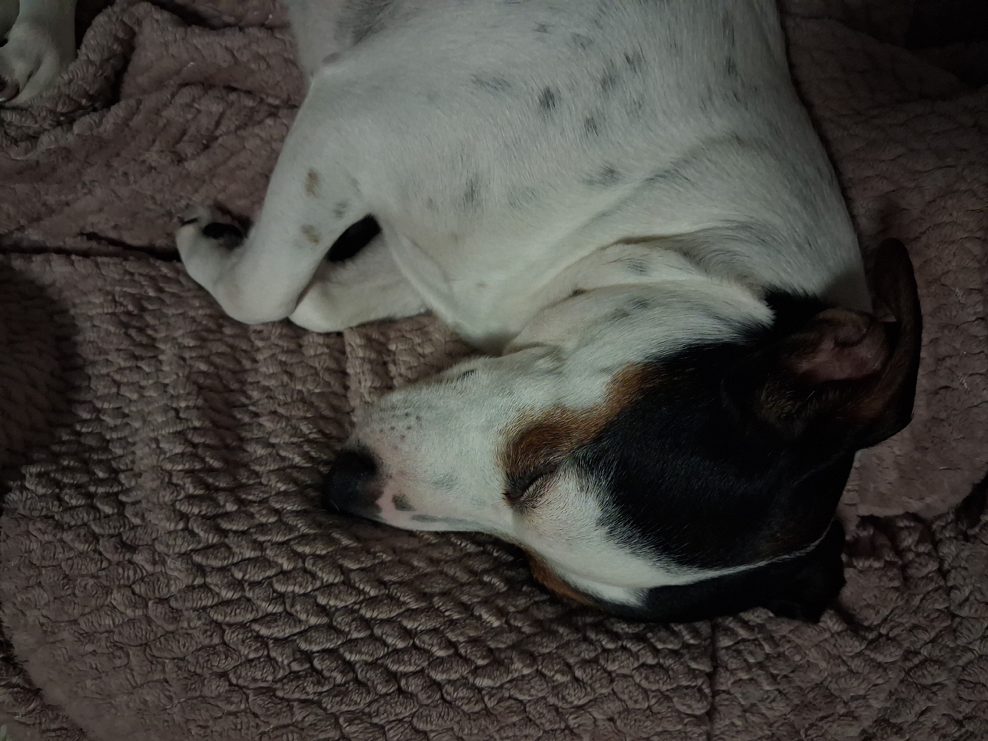 A dog sleeps on a brown textured blanket. The dog is predominantly white with black markings on its head and small black spots on its body. The blanket has a repeating, raised pattern. The location is unknown and there is no indication it is in Varna, Bulgaria.