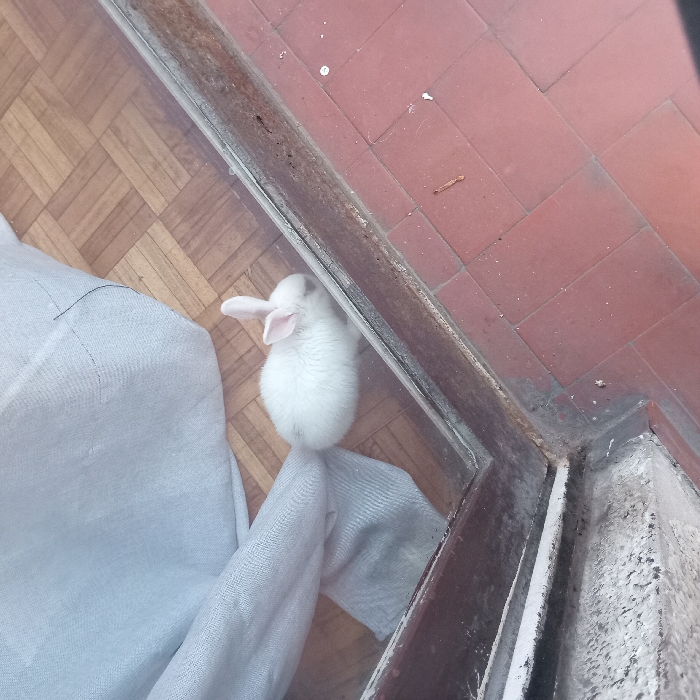 A small, white, juvenile rabbit with pink inner ear interiors and a faint brownish marking around its muzzle is present on a light-colored wooden floor exhibiting a parquet pattern. The rabbit is positioned next to a crumpled light grey textile object, possibly a curtain or blanket. This interior space is separated by a clear glass pane, held within a dark brown, weathered wooden frame, from an adjacent exterior or semi-exterior area. The wooden frame displays signs of surface wear and has a minimal accumulation of white residue on its lower section. The exterior area features a floor constructed of reddish-brown rectangular tiles. Scattered across the tiled surface are a singular thin, dry, brown organic fragment and several small white particulate specks. No human subjects are visible. The architectural elements and construction materials, specifically the parquet flooring, the style of reddish-brown exterior tiling, and the aged wooden frame, are consistent with residential buildings commonly found in various neighborhoods across Buenos Aires, Argentina.