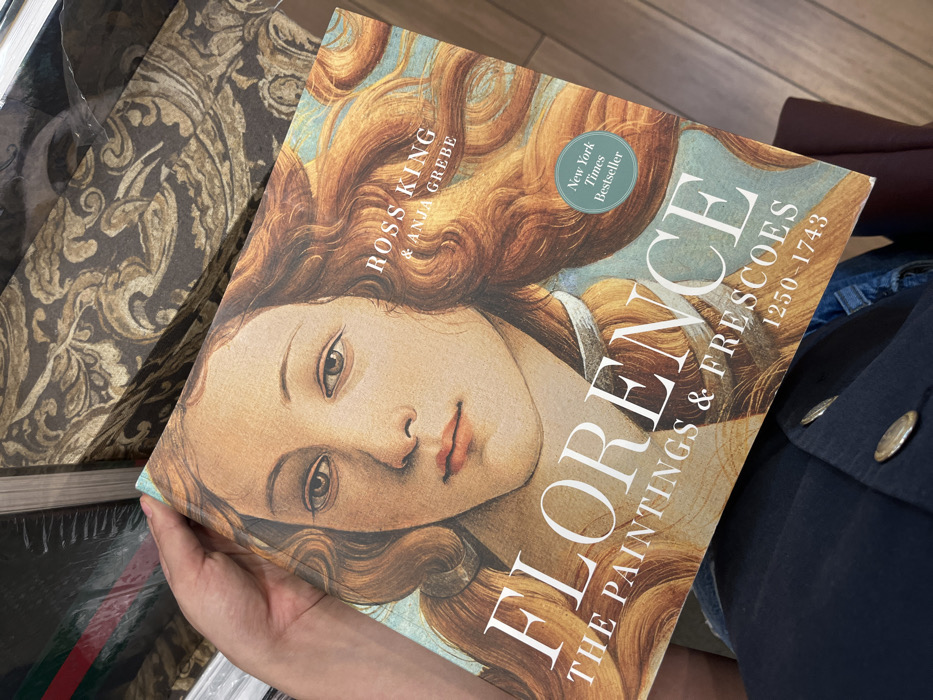 A person's left hand holds an open copy of the hardcover book "FLORENCE THE PAINTINGS & FRESCOES 1250 - 1743" by Ross King & Anja Grebe