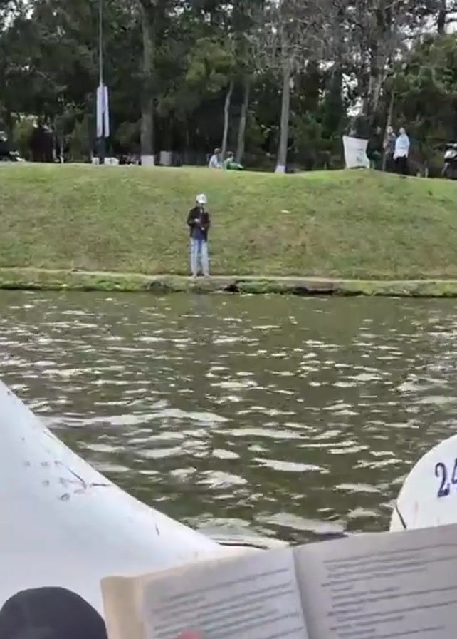 person reading a book in a swan-shaped paddle boat on a lake. The paddle boat has the number "24" on the side. Across the water, a person stands on the edge of the bank fishing with a rod and reel. The camera follows them as they walk along the bank, away from the person in the paddle boat. In the background, two other people are walking along the top of the bank. The scene is set in a park-like environment with trees and grass.