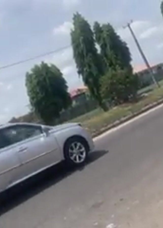 The video starts with a street scene, showing various vehicles moving on a road. A blue van and a silver SUV are visible, as well as two yellow and black auto rickshaws, also known as "Keke Napep", driving down the road. The environment includes trees, buildings, and utility poles against a bright, slightly overcast sky. The scene then cuts to an interior shot, focusing on the bottom portion of a vehicle's interior, specifically showing a dirty seat and seatbelt. The camera seems to be placed below the seat, capturing a view from near the floor of the vehicle. The angle suggests it may be from a vehicle like an auto rickshaw.