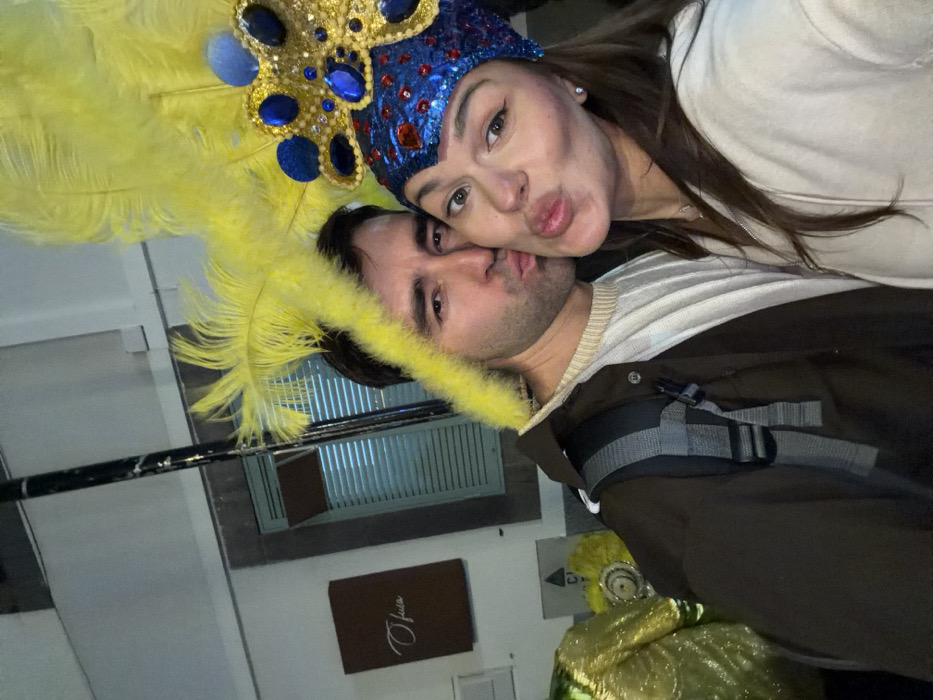 A photo shows a man and a woman posing closely together. The woman wears a blue sequined headdress with gold and blue jewels, and the man has yellow feathers near his head. They are both making kissing faces at the camera. The man wears a brown jacket with grey straps. Behind them are a sign that says "Tfura", some window blinds, and a mannequin dressed in a shiny yellow costume.