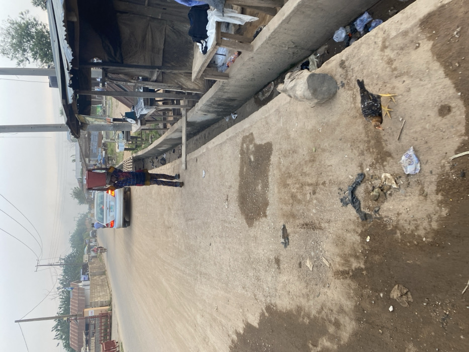 A roadside scene features a person carrying a red bucket on their head, walking near a white car. A chicken pecks at the ground amidst litter and debris. Structures with corrugated roofs line the road, possibly shops or dwellings. A concrete drainage ditch runs parallel to the street, with items scattered inside. The image captures a slice of daily life in a rural or semi-urban setting, with the interplay of pedestrians, vehicles, and animals.