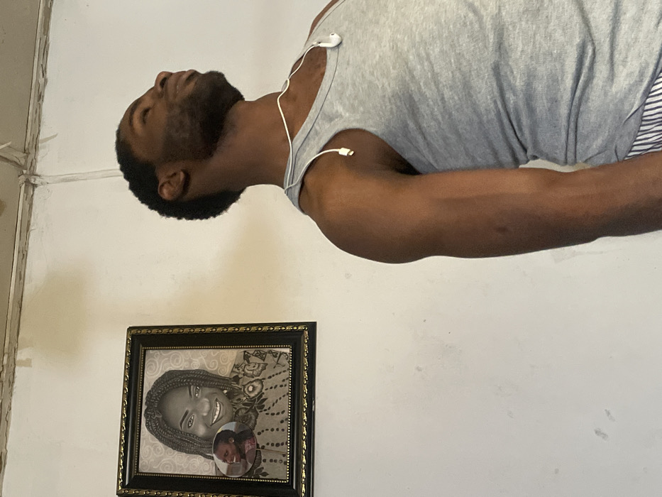 In an interior setting located in Jos, Nigeria, a dark-skinned male is depicted from the chest up, in profile, facing upwards and slightly to the right with his eyes closed or squinting. He wears a grey tank top, and white wired earphones, featuring a visible Lightning connector, are draped around his neck. To his left, mounted on an off-white wall exhibiting minor scuffs and a vertical utility wire near the ceiling, is a framed black-and-white portrait drawing of a smiling woman with braided hair. A smaller, circular color photograph of a different woman is overlaid on the lower-left corner of the larger portrait. The scene is illuminated by ambient light.