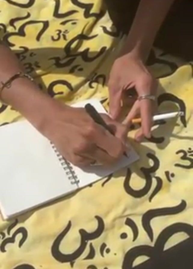 A person is seated on a yellow patterned blanket and writing in a notebook with a pen. A lit cigarette is held between the fingers of their writing hand. A mobile phone is to the side. The person is wearing jewelry on their wrists and fingers. The blanket has black symbols printed on it. The background is blurry.