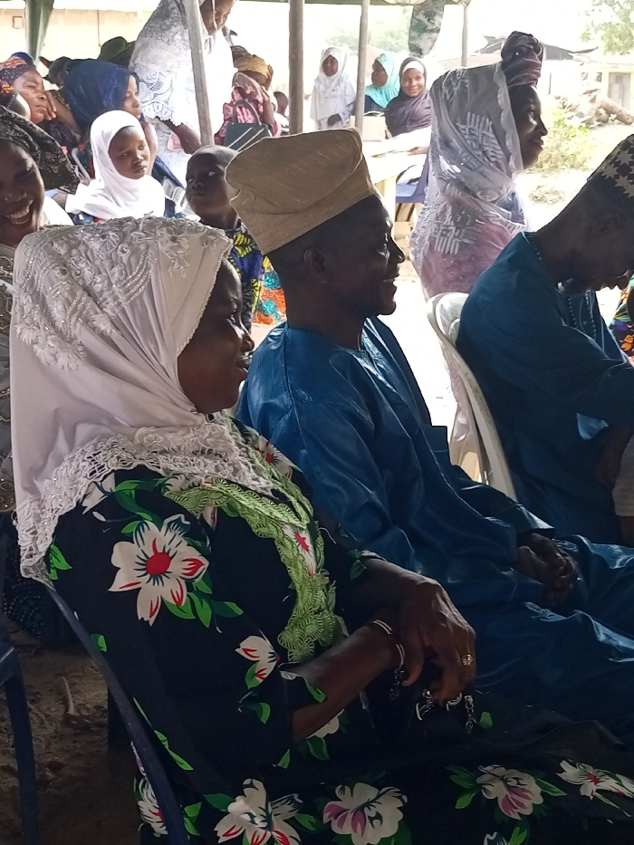 The image captures a gathering of approximately twenty individuals, including adults and children, seated within an open-air or semi-sheltered environment in Erin-osun, Nigeria. In the foreground, a woman on the left is seated in profile, facing right. She wears a white, elaborately embroidered headscarf and a dark floral dress with prominent white, red, and green blossoms. Her hands are clasped in her lap, holding a small, dark object, possibly prayer beads, and she wears a gold-toned ring on her right ring finger. Next to her, a man in a vibrant blue traditional garment and a light brown, ridged cap is seated, also facing right, with a subtle smile. To his right, another man in a similar blue garment and a dark patterned cap is partially visible, also seated. In the mid-ground and background, numerous other individuals are seated or standing. Many women and girls wear head coverings, including white, purple, and light blue hijabs. Several individuals in the background are observed looking to the right, some with smiles. The setting features simple white plastic chairs. Wooden posts are visible, supporting an overhead structure, indicative of a communal shelter. The ground surface appears to be dry earth or sand. Distant foliage is visible in the bright daylight, suggesting an outdoor or semi-outdoor event.
