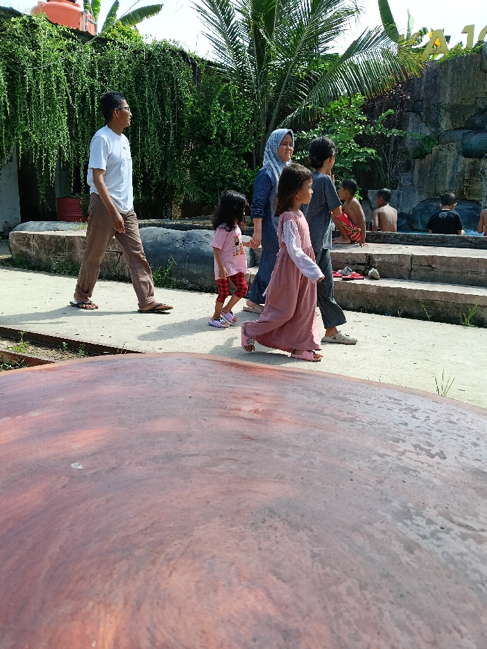 A family strolls outdoors on a bright day. A man in a white shirt and brown pants leads the way, followed by a woman in a hijab holding the hand of a young girl in pink. Beside them walks a child in gray. In the background, children play in a pool beneath a rocky, leafy area. A large, round, textured surface dominates the foreground, casting shadows on the ground.