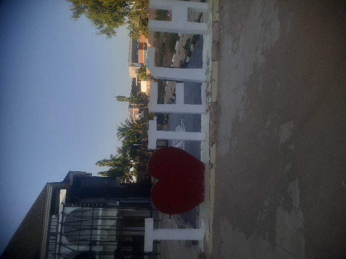 The image features an "I <3 IFE" sign in front of a building. The letter "I" is white with a red heart taking the place of the word "love". The "IFE" is written with white block letters, lined by yellowish paint at the bottom. The building behind has a dark exterior and a reflective glass facade, with "PLICITY GROUP" visible. The background includes greenery and additional buildings under a bright sky.