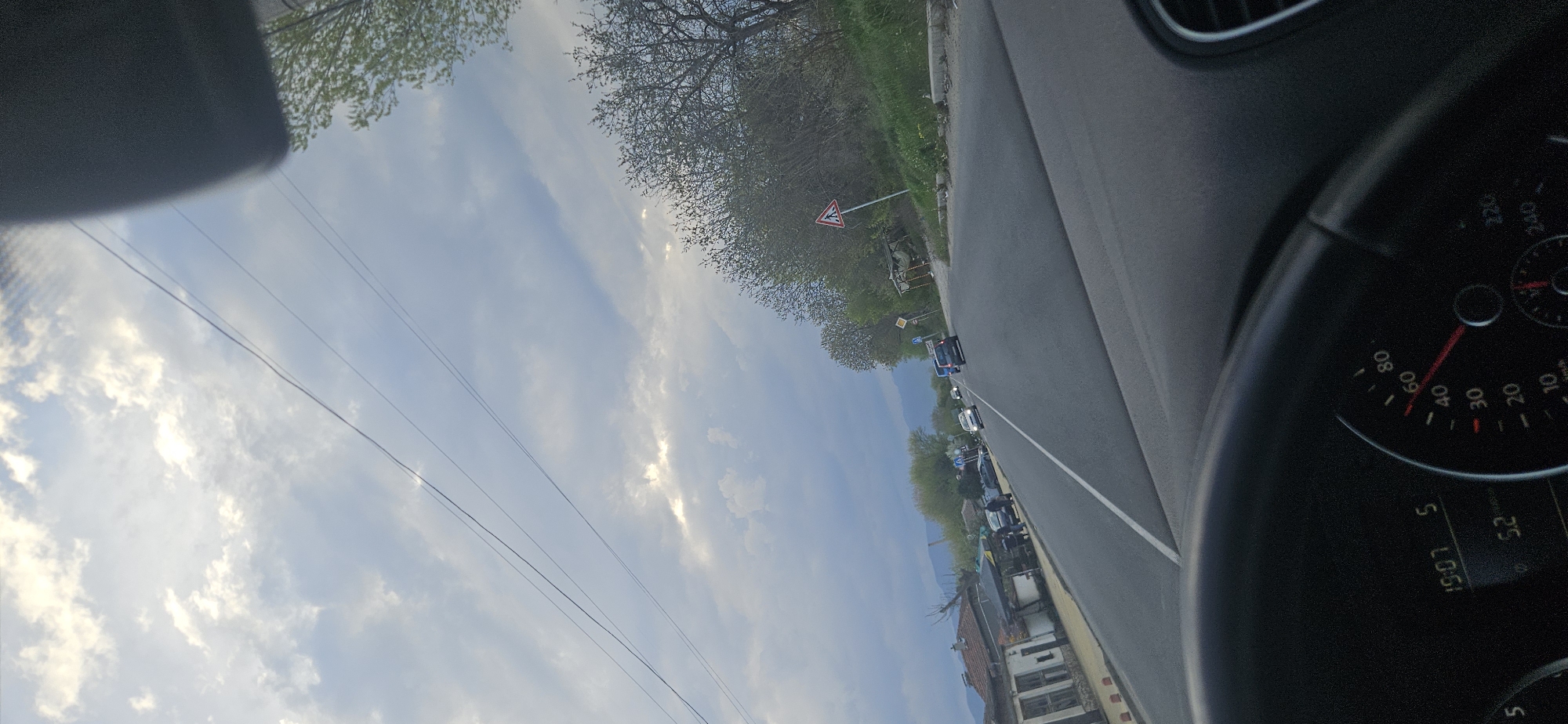 view from inside a vehicle, presumably a car, driving on a road. The car's dashboard and speedometer are visible on the right, indicating a speed of approximately 52 kilometers per hour. The speedometer's clock is displayed. Through the windshield, a road stretches ahead with several cars in the distance, suggesting a queue of traffic. The roadside features trees and buildings, indicating a semi-urban or rural environment. A road sign is visible on the right, warning of a junction. Overhead power lines cross the sky, which is partly cloudy with blue patches. Without a precise location or landmark details of Zvanichevo, Bulgaria, it is not possible to identify with certainty any specific building or street. It can be said, though, the location is somewhere along a road with light traffic, with trees and buildings close to the road.