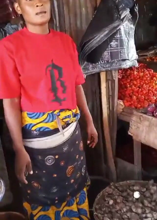 A person in a red t-shirt and a patterned skirt stands inside a market stall. The stall has various items for sale including beans, nuts, tomatoes and onions. Another person in a white t-shirt and blue shorts approaches the stall, pays with a phone and is handed a black plastic bag.