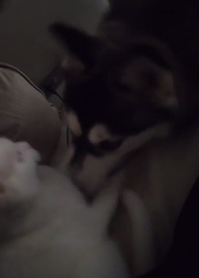 A close-up shot shows a white cat lying down while a dog nuzzles it. The white cat's eyes are closed, and its pink ears are visible. The dog is larger, with dark brown and white fur. The background is blurry, showing a couch cushion and a dark space. The dog moves its head towards the cat. The lighting is dim. The dog then starts to lick the white cat.
