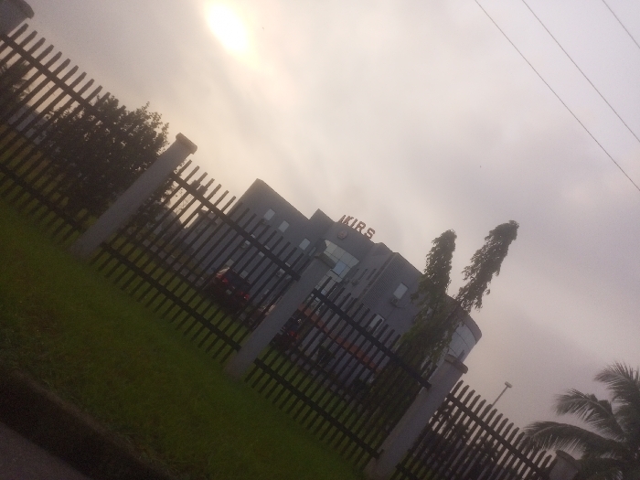 A tilted shot reveals a modern building with "IKIRS" displayed on top. A dark, slatted fence with concrete posts runs along a grassy area. Two tall, slender trees stand near the building, while palm tree leaves are visible on the right. A red car is parked near the building, partially obscured by the fence. Overhead, utility lines stretch across a hazy, overcast sky with the sun showing through.