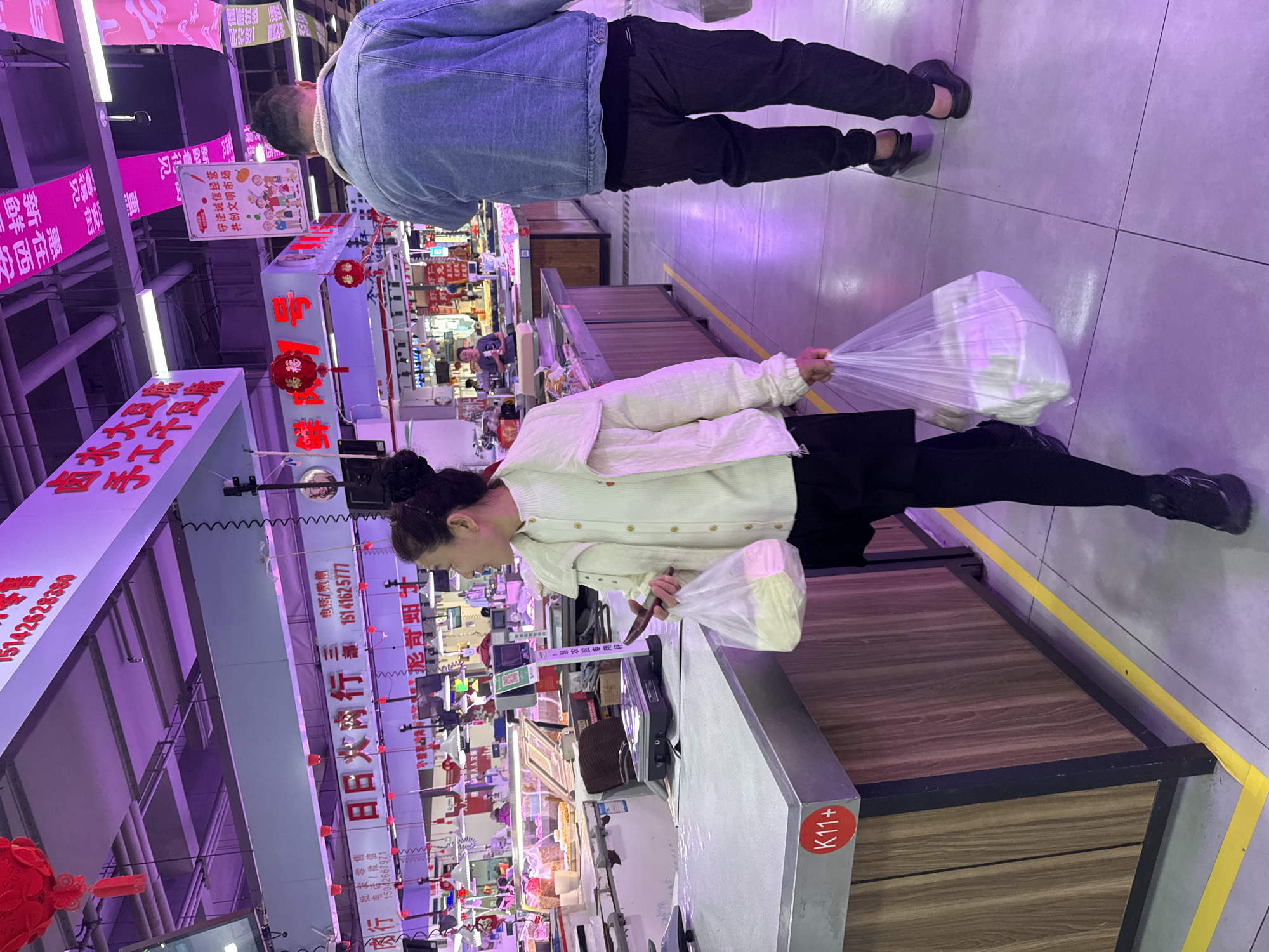 scene inside what appears to be a market, likely a meat market based on signage. A woman in a white jacket and black pants is standing at a counter with a scale, holding plastic bags filled with what looks like food items. She is in the process of weighing the items on the scale. Behind her and to the left, various market stalls are visible with hanging meats, price signs, and other goods. Chinese characters and phone numbers are visible on signs overhead. Another person is seen from behind in the upper part of the image, wearing a denim jacket and black pants. The overall environment is brightly lit with a purple-ish hue. A sign on the counter reads "K11+". Based on the signs containing Chinese characters and the phone number, this market is likely located in Guta, China. The signs indicate "meat products" and provide contact information for the vendors.