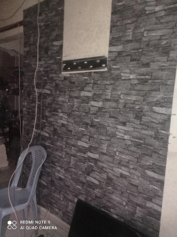 The image displays an indoor scene within the city of Khan Yunis, Palestinian Territory. The primary subject is a wall covered in dark grey wallpaper patterned to resemble irregularly stacked stone blocks. Mounted on the upper central portion of this wall is a light-colored rectangular panel, approximately 0.5 meters in height, featuring a dark horizontal strip with multiple small, dark, circular or square elements along its lower edge. To the left, a light grey plastic chair with a perforated backrest is visible, facing left. White electrical cables run vertically along the wall's left side. A dark, rectangular object is partially visible in the bottom right corner of the frame. No individuals are present.