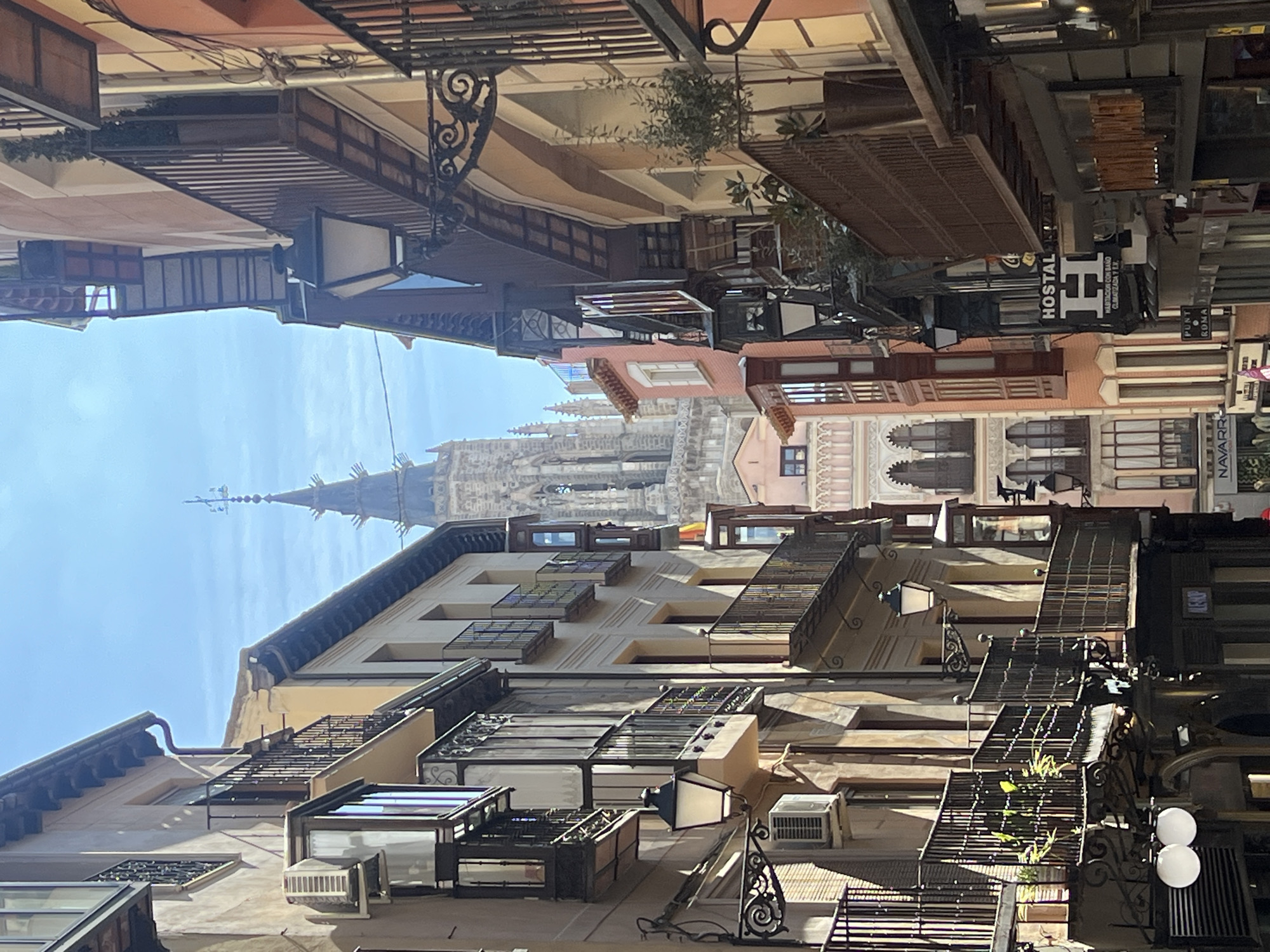 The image depicts a narrow, sunlit street in the city of Toledo, Spain. The street is framed by multi-story buildings on both sides, leading the eye towards the prominent, intricate Gothic bell tower of the Cathedral of Toledo in the background. The buildings lining the street exhibit varied architectural styles and colors. On the left, facades are predominantly light beige, featuring multiple dark wrought-iron balconies, some enclosed glass balconies, and traditional black street lanterns mounted on ornate iron brackets. An external air conditioning unit is visible on one building's facade. Strong shadows are cast on this side, indicating sunlight from the upper right. On the right, buildings display warmer tones including orange, cream, and brown. They also feature wrought-iron balconies, some adorned with potted plants, and additional decorative street lanterns. A prominent vertical sign for "HOSTAL H" is visible on a building on the right, along with smaller commercial signs. In the midground, between the immediate street buildings and the Cathedral, other structures with arched windows and varied facade colors are discernible. The sky above is bright blue with scattered white clouds. No individuals or active subjects are visible within the frame.