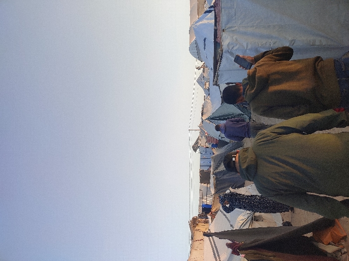 Tents fill a camp, likely for refugees or displaced people. Several figures stand among the tents. One person holds a cell phone, possibly documenting the scene. Another is wearing a green coat and appears to be looking around. A person in purple stands in the background. A woman in a patterned dress walks among the tents. The sky is pale blue.