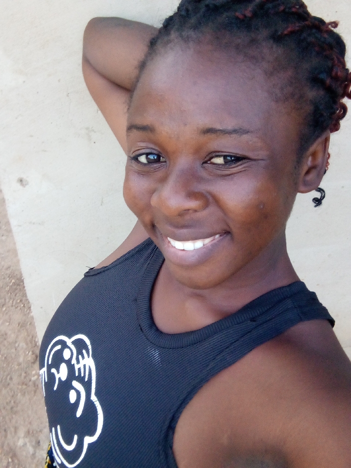 A smiling African woman poses indoors, her head resting on her hand. She wears a black sleeveless shirt with a white graphic design. Her hair is styled in braids with reddish highlights near her ears. The background is a light, neutral wall. Her facial expression is warm and friendly.