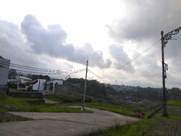 The image displays a daytime landscape in Sintgaing, Myanmar, under a heavily overcast sky. A paved roadway occupies the foreground, bordered by unkempt grassy verges. On the right, an ornamental street lamp post, dark brown with a decorative finial, stands upright, from which torn white fabric hangs. A secondary utility pole with multiple overhead wires crosses the mid-ground. To the left, several white residential structures with visible roofs are situated on a gentle incline, fronted by a low stone wall. The background features rolling green hills with dense tree cover and a sprawling settlement of buildings, punctuated by communication towers on the distant horizon. No human subjects or discernible activity are depicted.