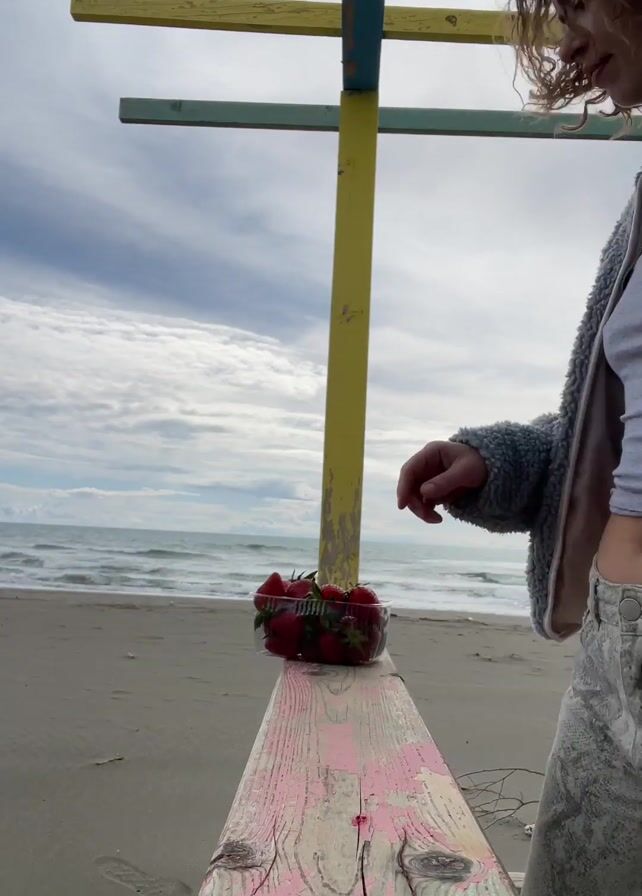 On a windy beach, a woman with curly red hair eats a strawberry while standing behind a weathered, painted railing. She wears a fuzzy blue jacket over a gray shirt and patterned pants. A clear plastic container filled with strawberries sits on the railing in front of her. In the background, the ocean stretches to the horizon under a sky with scattered clouds. Behind her, a colorful structure made of yellow, green, and pink wooden beams is visible. She picks up a strawberry, looks at the camera, and then bites into it.