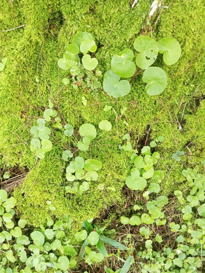 Lush green moss covers a surface, interspersed with various round-leaved plants