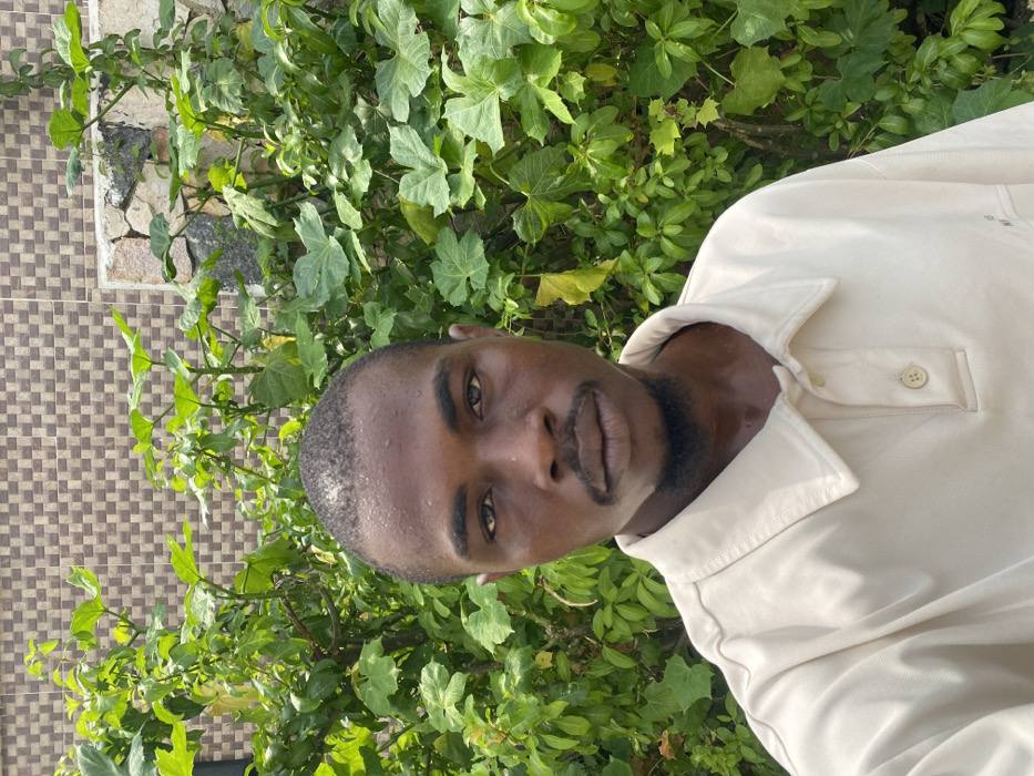 An adult male with dark skin, short dark hair, a mustache, and a goatee is depicted in a frontal, medium-shot portrait in Langbasa, Nigeria