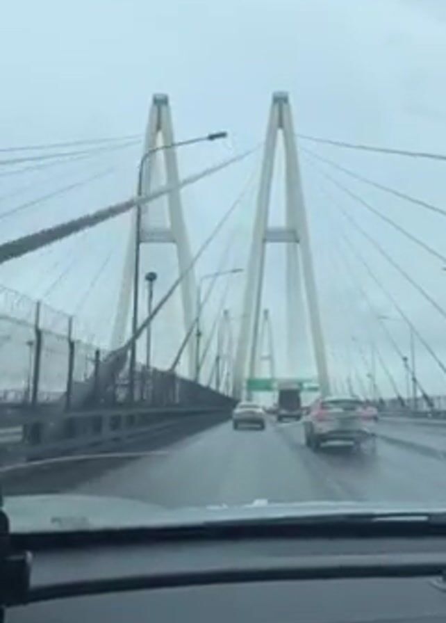 car driving on a bridge on a cloudy day. The bridge is a cable-stayed bridge with two tall towers. There are other cars and trucks on the bridge. The road appears to be wet. The view is from inside the car.