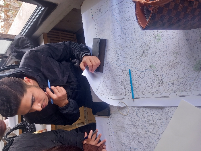 The image depicts an indoor scene in Al-Muhajerin Municipality, Syria. A young male, wearing a black hooded jacket, is seated at a table, holding a blue pen near his chin with his right hand and a sheet of paper in his left, intently focused on the items below. Spread across the light-colored table are multiple sheets of paper forming a detailed map, overlaid with intricate lines and some green areas. Adjacent to the map and papers are a black smartphone lying face down, a dark rectangular wallet or pouch, and a light blue pencil positioned horizontally on the map. The hand of another individual is visible on the left side of the table, resting on a white sheet of paper. In the background, a large window with a black frame overlooks an exterior scene with bare tree branches, and a white radiator is situated beneath the window. A brown and black checkered bag is visible in the lower right foreground.