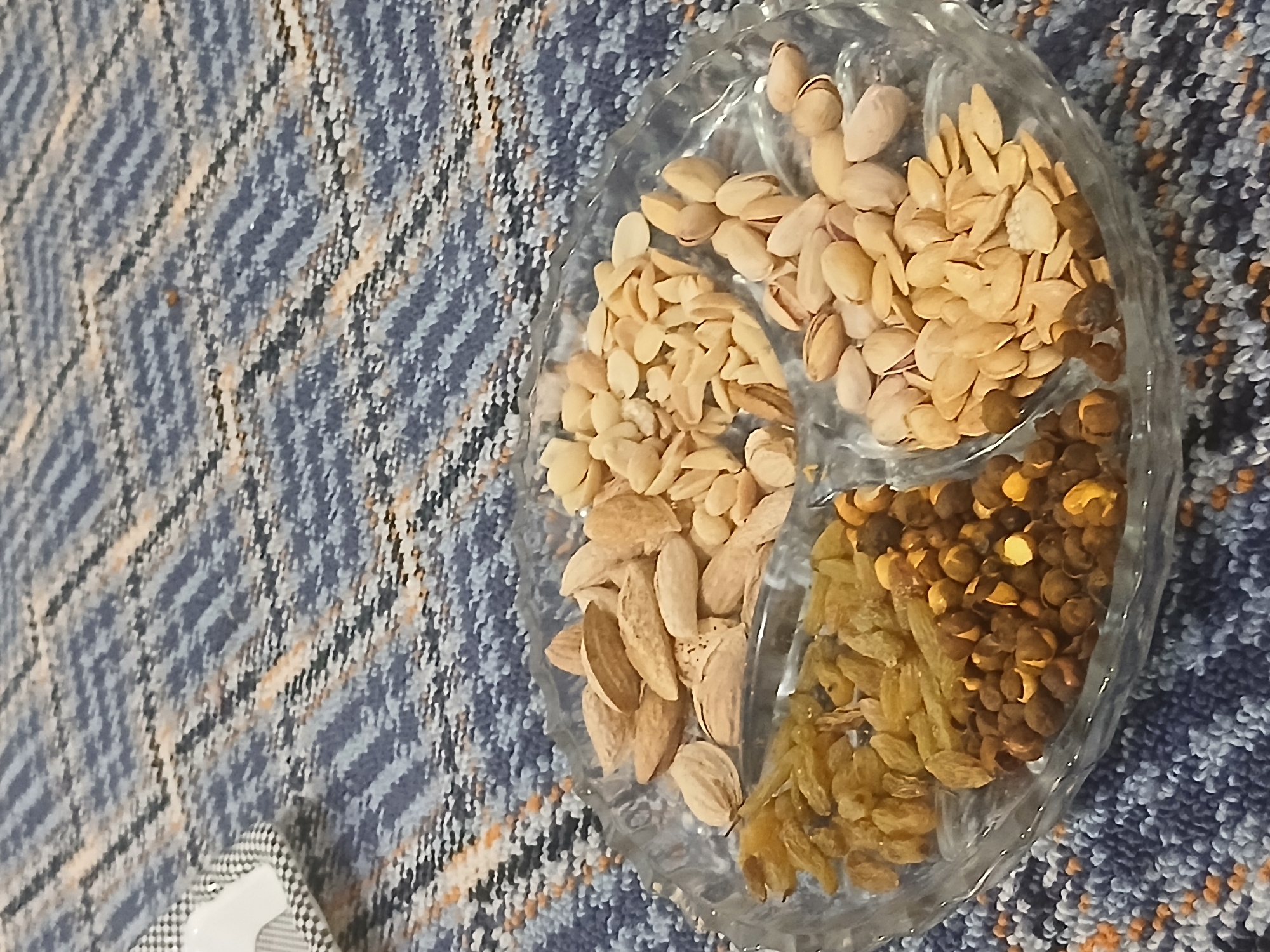 A clear glass segmented dish is centrally positioned on a patterned textile surface, likely a rug or carpet. The dish contains four distinct food items. The top left segment holds approximately two dozen light brown almonds in their shells. The top right segment contains numerous pale yellow shelled pistachios. The bottom left segment is filled with a mixture of golden raisins and small, dark brown roasted chickpeas. The bottom right segment primarily contains pale, flattened pumpkin seeds, interspersed with some shelled pistachios. The underlying textile features a woven chevron or zig-zag pattern composed of blue, grey, beige, and dark brown threads. The scene is static, devoid of people, specific actions, or interactions. The image does not contain identifiable landmarks or details to pinpoint a precise location within Quetta, Pakistan.