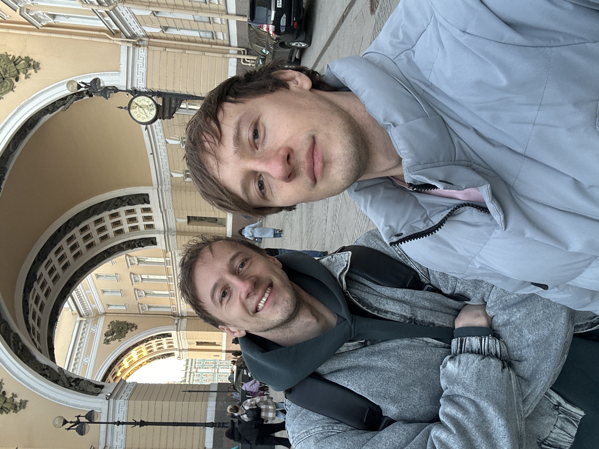 Two adult males are depicted in a selfie, positioned on a paved street in Saint Petersburg, Russia, with the General Staff Building Arch dominating the background. The man on the left, with light brown hair and a beard, smiles directly at the camera. He wears a dark green hooded sweatshirt under a light gray denim jacket and has a black backpack on his shoulders; his arms are crossed over his chest. The man on the right, also with light brown hair, maintains a neutral expression and is holding the camera. He wears a light pink shirt under a light blue puffer jacket. Behind the subjects, the grand, light-yellow General Staff Building Arch frames the scene. Through the archway, a portion of the green and white Winter Palace is visible. To the right of the arch, another section of the General Staff Building facade is present, featuring multiple windows and an ornate black lamppost with a street clock displaying approximately 12:10. Several pedestrians in casual attire are visible in the mid-ground and background, walking. A dark-colored SUV is parked on the right side of the street. The ground is paved with stone blocks. The lighting is diffused, suggesting an overcast sky.