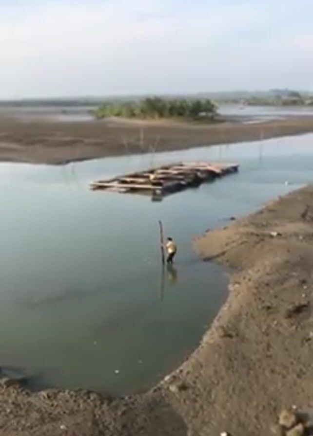 landscape with a man wading in a body of water. The scene appears to be a coastal area or river delta, where mudflats or sandbars are prevalent. The water is calm, and the sky is overcast with a light blue hue. A raft-like structure made of logs or bamboo is seen floating nearby. The man is standing in the water, possibly probing the bottom with a long pole. The surrounding land is mostly barren with sparse vegetation. The perspective is from a slightly elevated position, giving a wide view of the scene.