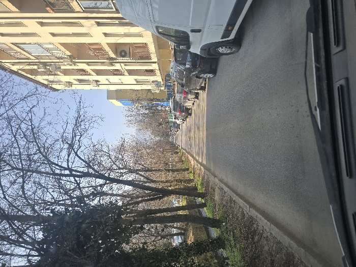 The image presents an urban street scene in Sofia, Bulgaria, specifically looking north along Ulitsa "Mitropolit Kiril Vidinski" in the Lozenets district. The perspective is from inside a vehicle, with the dashboard and windshield wiper blades visible at the bottom. The scene is captured on a clear day with a light blue sky. On the left side, a narrow, concrete-lined section of the Perlovska River runs parallel to the street. The riverbank is densely vegetated with green ivy and a line of bare deciduous trees. A narrow dirt strip with scattered dry leaves and a concrete curb separates the river area from the asphalt road. The asphalt road extends into the distance, appearing worn with no visible markings. Along the right side of the road, a continuous line of vehicles is parked. The closest vehicle on the right is a white commercial van, partially visible. Behind it, a black SUV is followed by various other dark-colored cars, extending down the street. Behind the parked vehicles stands a multi-story residential building with a light beige facade. It features multiple balconies with dark railings and numerous external air conditioning units mounted below windows and balconies. Further down the street on the right, another building with sections painted blue and yellow is partially visible. No people are discernible in the scene. The deciduous trees, mostly bare, suggest late winter or early spring.